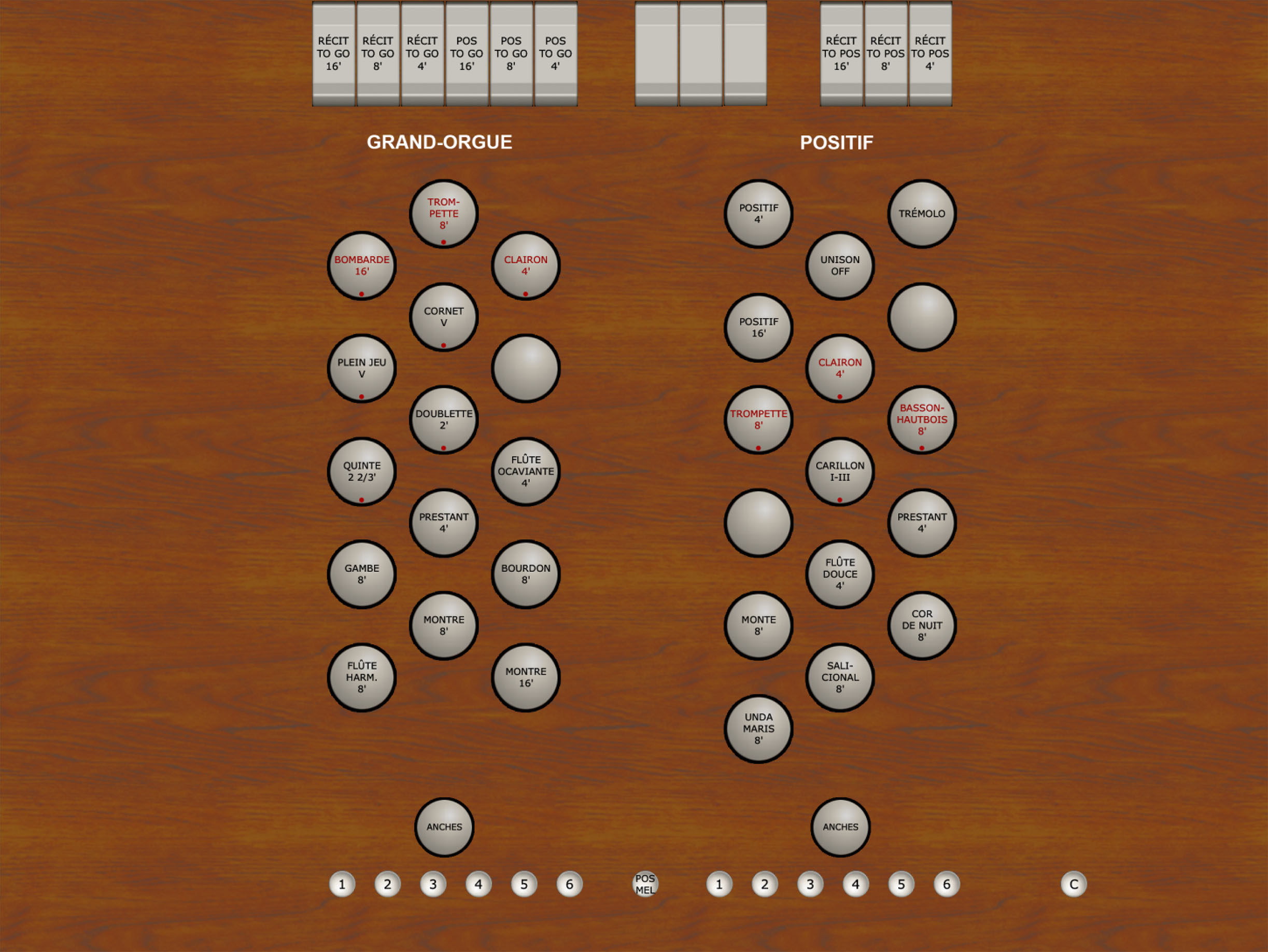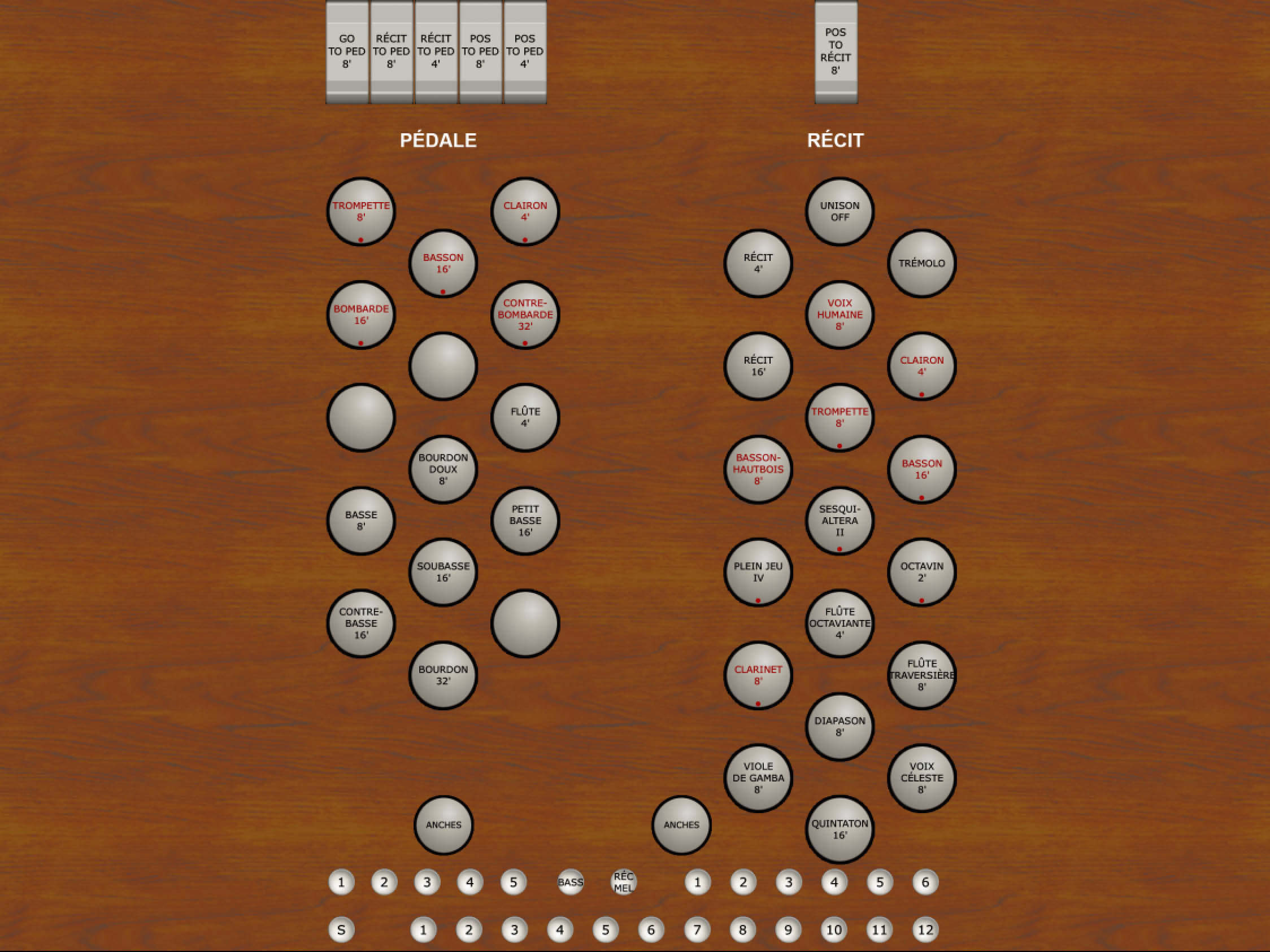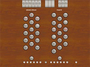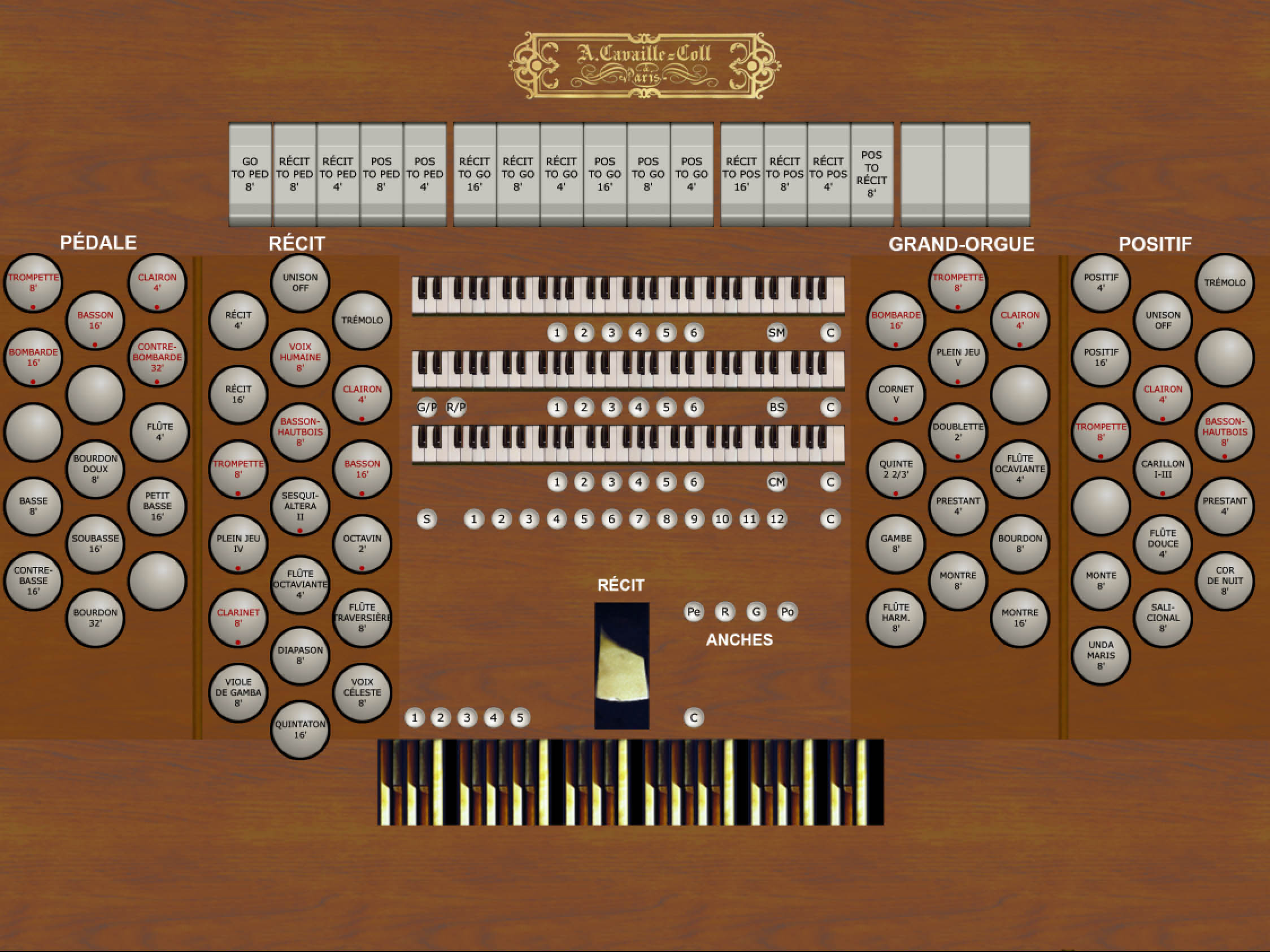 Finally, I added a full complement of couplers and a large combination action. There are also the standard reversable pistons and "bass" and "melody" functions - mostly because they are so easy to create in Hauptwerk. None of these are accurate for an historic Cavaillé-Coll instrument. However, Cavaillé-Coll actually did create some of the first true adjustable combinations (the San Sulpice or-gan is the best example) and I believe if he were alive today, he would be using all of these more modern appliances. If it helps, think of my CC instrument as an historic Cavaillé-Coll organ that has been given a modern console – several of these do exist.