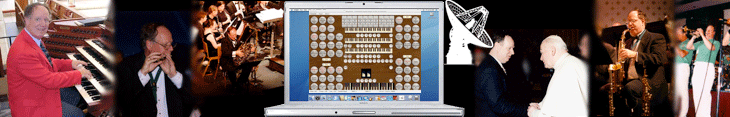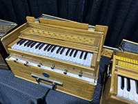 | Bhava is a company that imports harmoniums from India. This booth also caught my son, Elliot's eye, when he visited the show on Saturday. These are very nice quality instruments - but with only two ranks; 8' and 4'. The other drawknobs are for divided ranges or effects like tremolo. Unlike European (and American) harmoniums, these use positive air pressure rather than suction. The pressure comes from hand bellows behind the instruments. |
