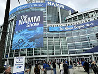 | I attended the 2023 NAMM Show on Friday, April 14. It was the only day I could attend, but the smaller show was very see-able in a single day. Here is the front of the Anaheim Convention Center with typical NAMM posters. |