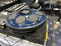 | You can find MIDI controllers in just about any shape nowadays. This one, from Lumen, is based on steel drum pans. It works very well as a percussion MIDI controller – but I have to admit that I am not proficient at pan-style playing. Scales are played by moving close to 180 degrees form the previous note and chromatics require a second entire pan. I am not sure how many musicians will want this device. |
