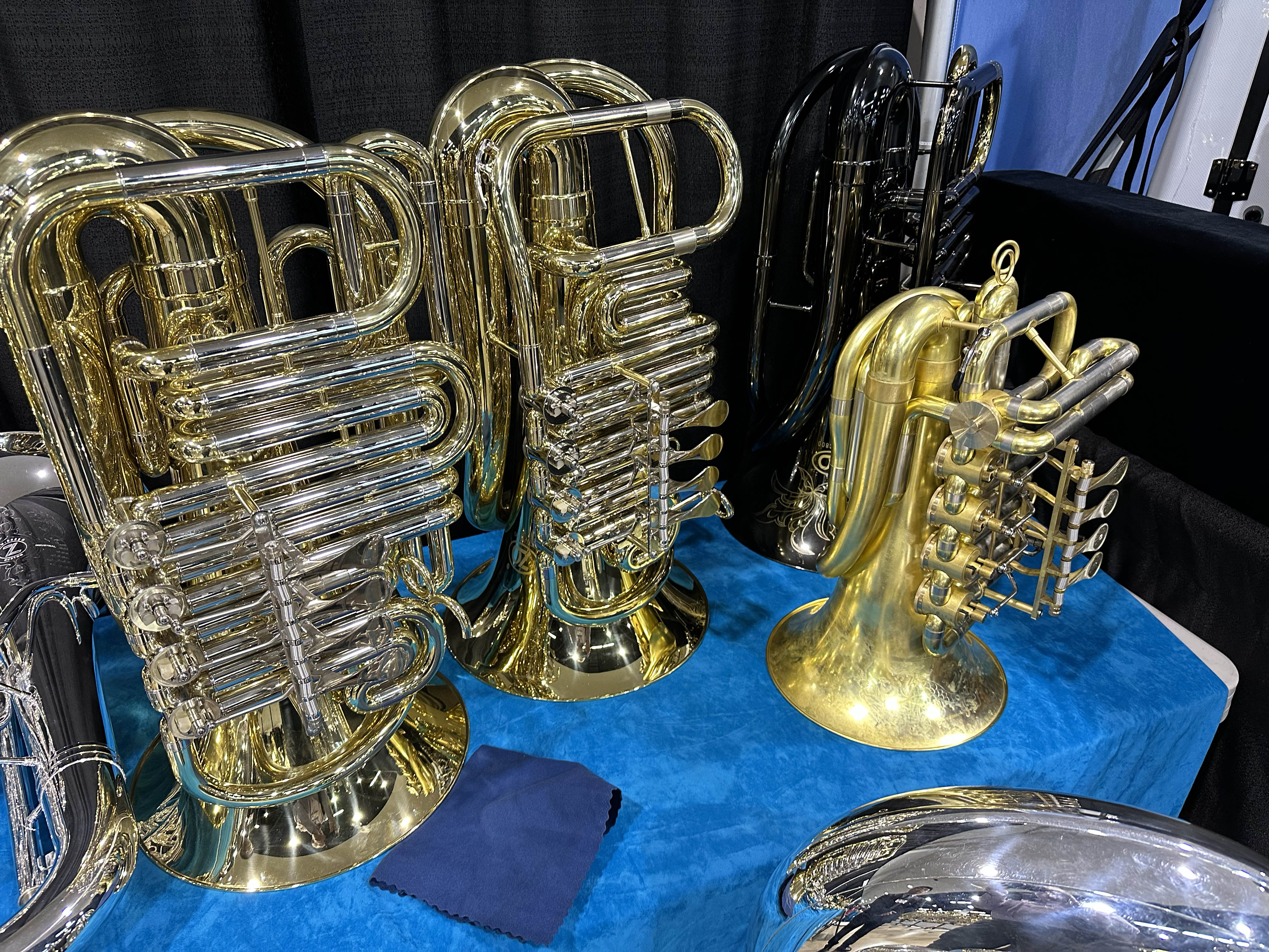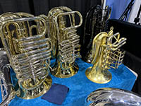 | Here are pocket tubas, in C, Bb, and F, from Zheng Du Musical Instruments, a Chinese company. I tried playing the C tuba, but the valves hardly moved. It did play well enough - on open notes. |