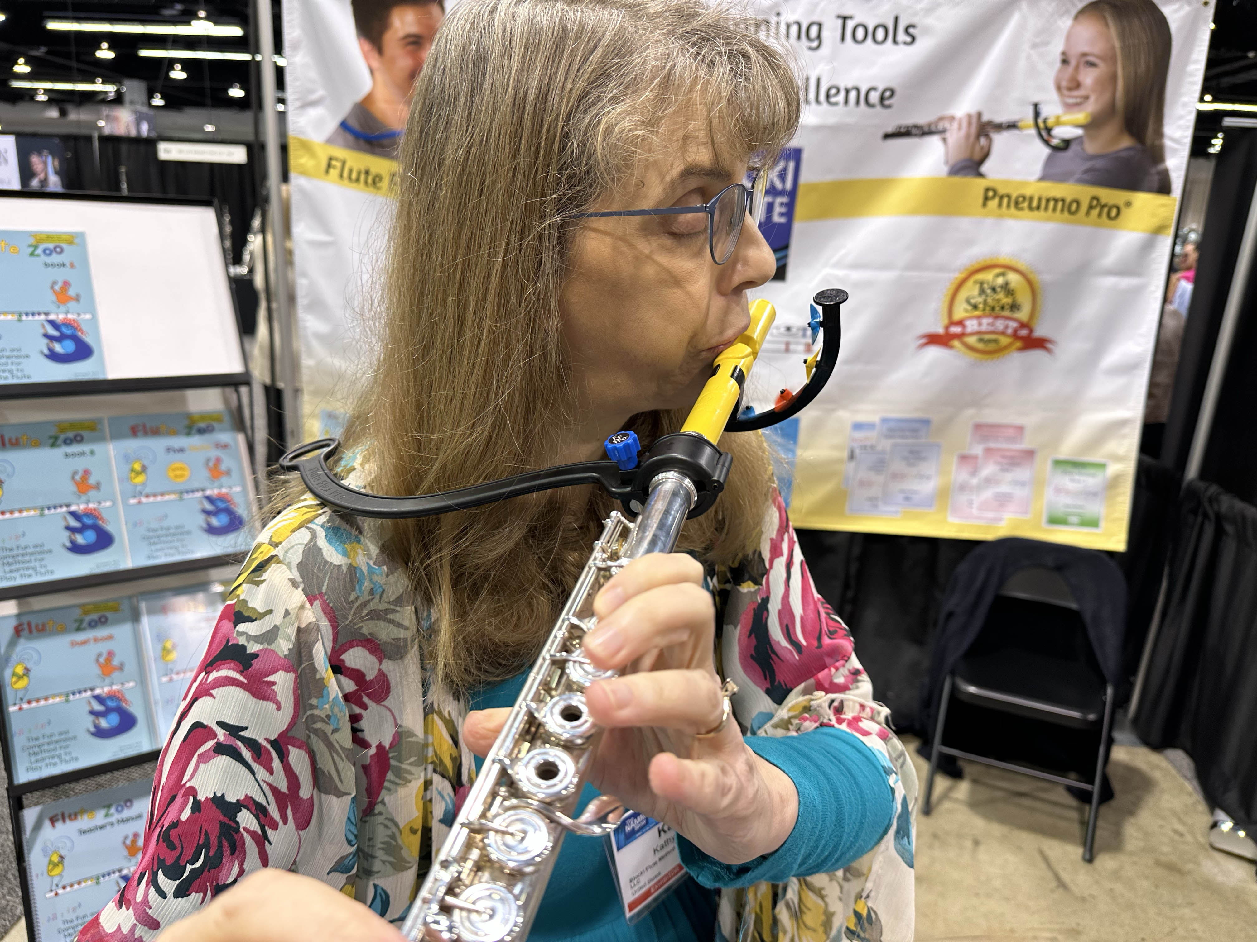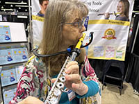 | This was a very interesting booth from Blocki Flute. The name of the company is a play on "blockflute" using the founder's name Kathy Blocki, who was actually there at the booth! Kathy has invented several devices to make teaching the flute easier. The yellow mouthpiece actually is not a mouthpiece. It has embedded wind vanes that spin only when the student is using a correct embouchure. The very small numeric scales on either side of the mouthpiece joint allow students to make an accurate and reproducible angle with the mouthpiece. The black device from the flute to her shoulder is intended to teach proper posture. She told me that the latter device was first invented by a colleague – but he used a bicycle yoke for his prototype. It was heaver and sharp, so he asked Kathy to develop the version shown here. |