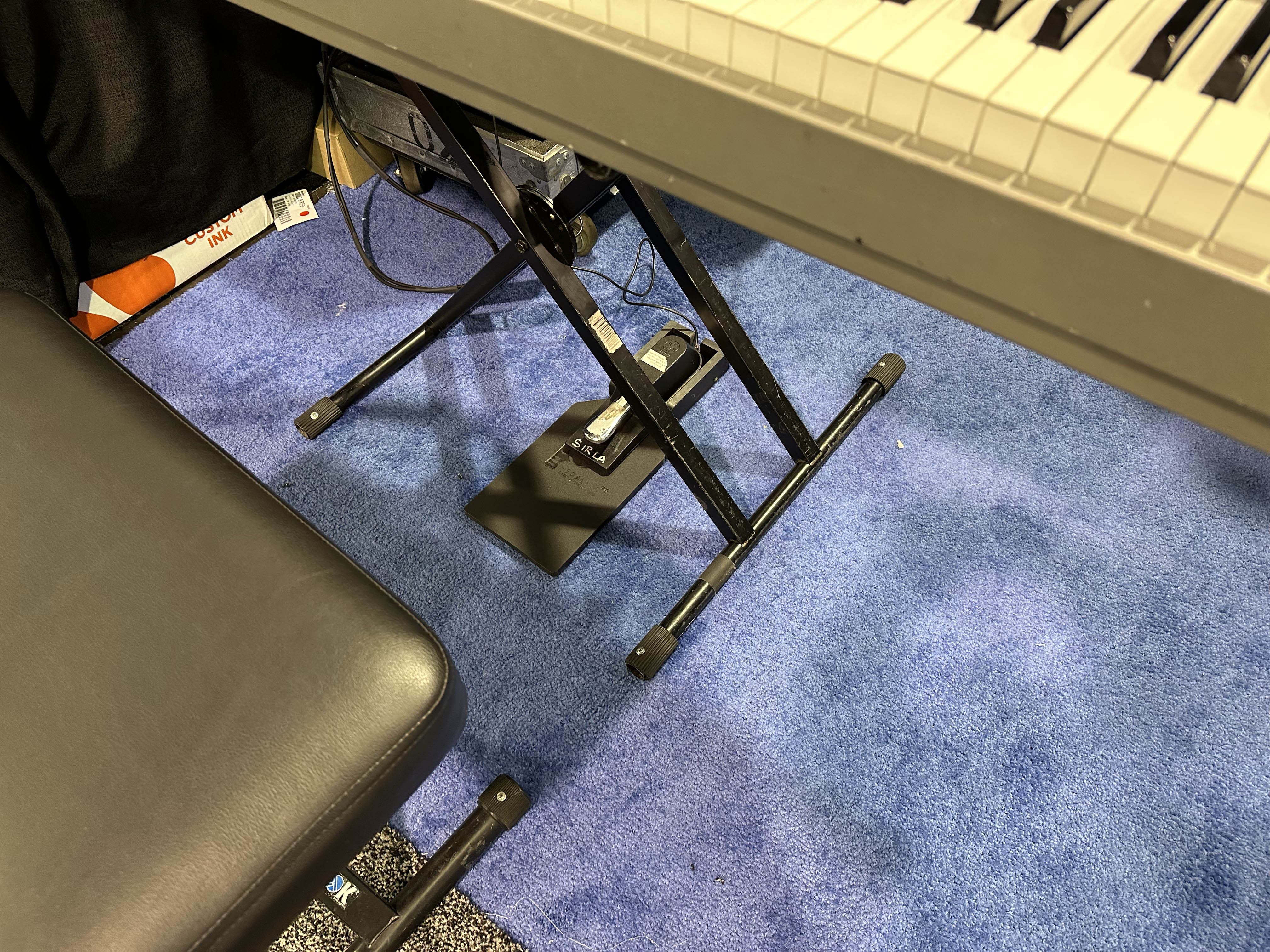 | This device, called PedalPal, is a large flexible base plate onto which you can strap your piano sustain pedal. This keeps the pedal from moving while you play – which I can assert is definitely annoying. It was fairly expensive for a device I think I could readily build myself. |