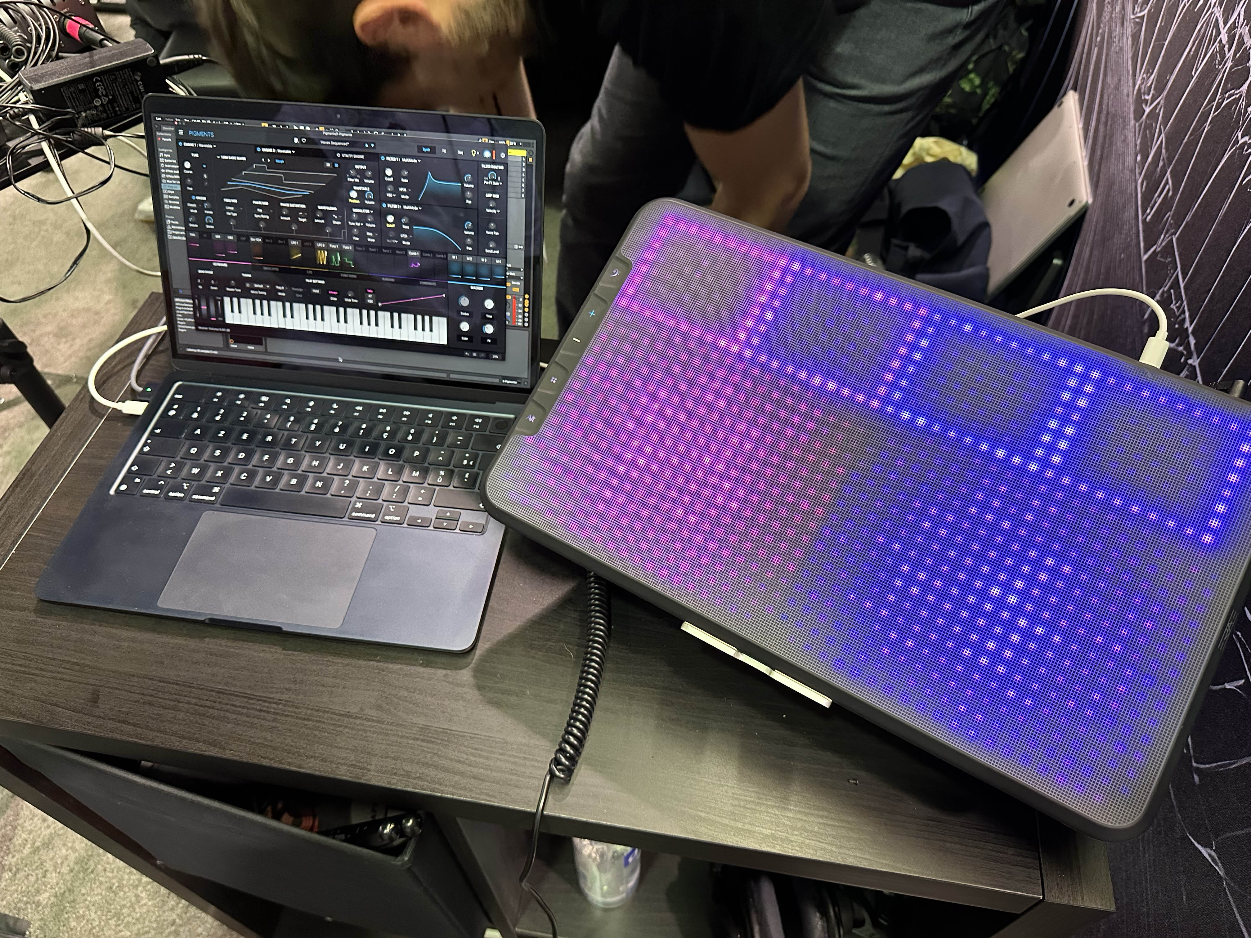 | The company here is called "this.is.NOISE". Despite the name, they make MIDI controllers that are VERY small. These 16 button controllers with seven shift levels are only about two inches on a side. I worry about breakage on devices this small, but the people at the booth say they have done a lot of testing and these are very rugged. |