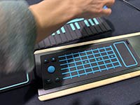 | This strange device is from another French company, Joue. It is a MIDI sensor array built into a small wooden tray. They make five different rubberized overlays that you can play into this tray. An RFID device on the overlay tells your computer what software to use to drive the system for the particular overlay. In this photo, you can see a guitar interface. Once the overlay s in the tray, you can use the controller - and then switch it to some other instrument later. I asked if a user could have the ability to create their own overlays - and they said that are discouraging this to protect their intellectual property. |