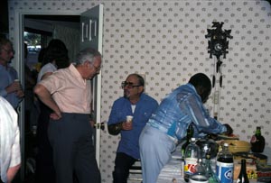 Ralph Deutsch talking with Manny Klein while Alton Pernell helps himself to some food